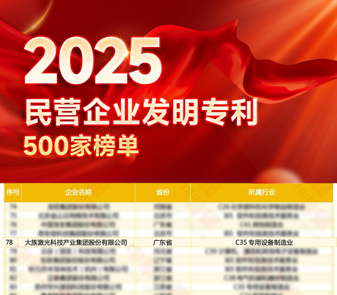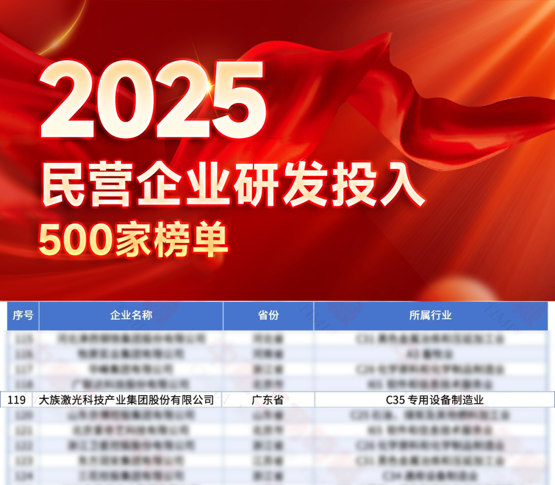 近日,在由全国工商联与陕西省人民政府共同主办的“2025民营经济创新发展大会”期间,全国工商联发布了《2024年度研发投入前1000家民营企业创新状况报告》,并揭晓了“民营企业研发投入500家”与“发明专利500家”榜单。大族激光荣登双榜,分别位列榜单第119位、第78位,展现科技创新投入和显著的创新成果。